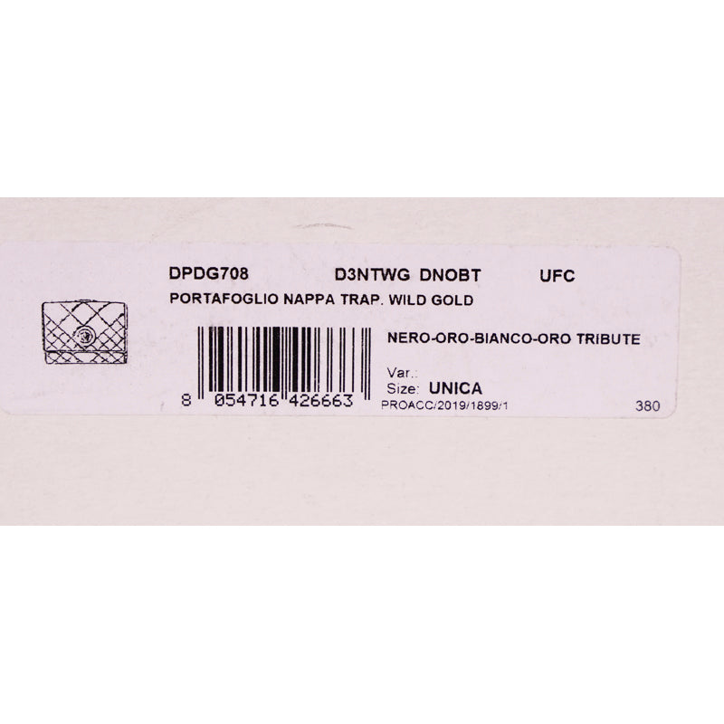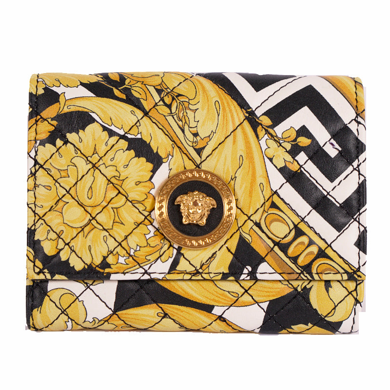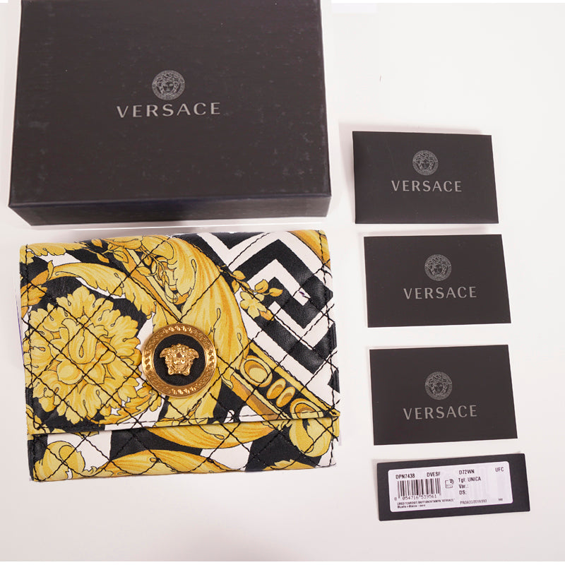 Authentic Versace wallet in a stunning Tribute print. White, black and gold Savage Barocco on quilted leather. Gold-tone hardware. Medusa head logo embellishment on front flap closure with large coin purse. Snap button rear with 6 card slots, large bill slot. Style DPDG708. Made in Italy. An amazing wallet, sure to get noticed.