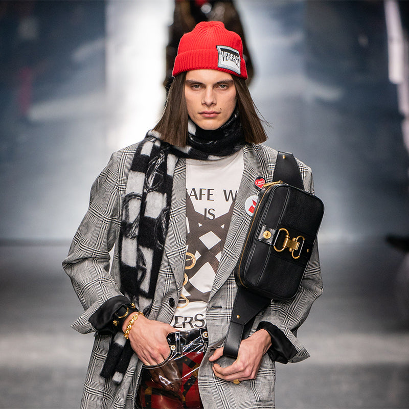 Authentic Versace scarf seen on the 2019 runway. Black and white geometric pattern with GV logo. Wool and mohair blend has a brushed finish in front and a knit in back. 45% mohair, 37% virgin wool, and 18% polyamide. Style number ISC3003, color Bianco-Nero, one size. Made in Italy. Pairs with everything from a suit to just jeans.