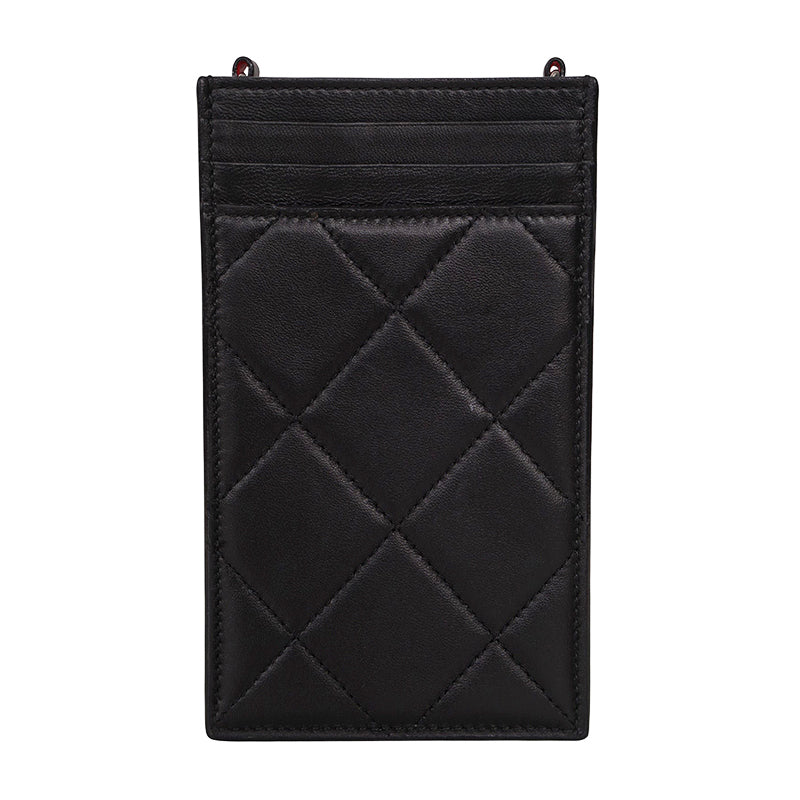Authentic Alexander McQueen phone mini bag that is perfect for on the go. Black quilted leather with white leather accents. Mini skull with crystal eyes in front and graffiti logo name across the front. Crossbody chain. Silver tone hardware. Open top. Exterior card slot in front and three card slots in back. Lined in red leather. Style 632035. Made in Italy. Great for a night out or just around town. Also great extra bag to back for vacations.