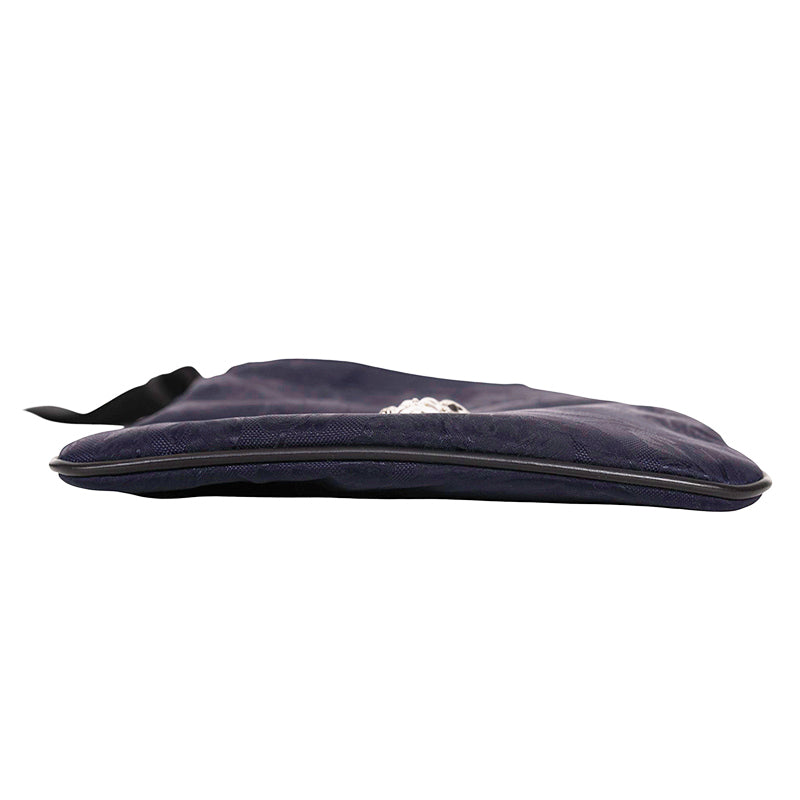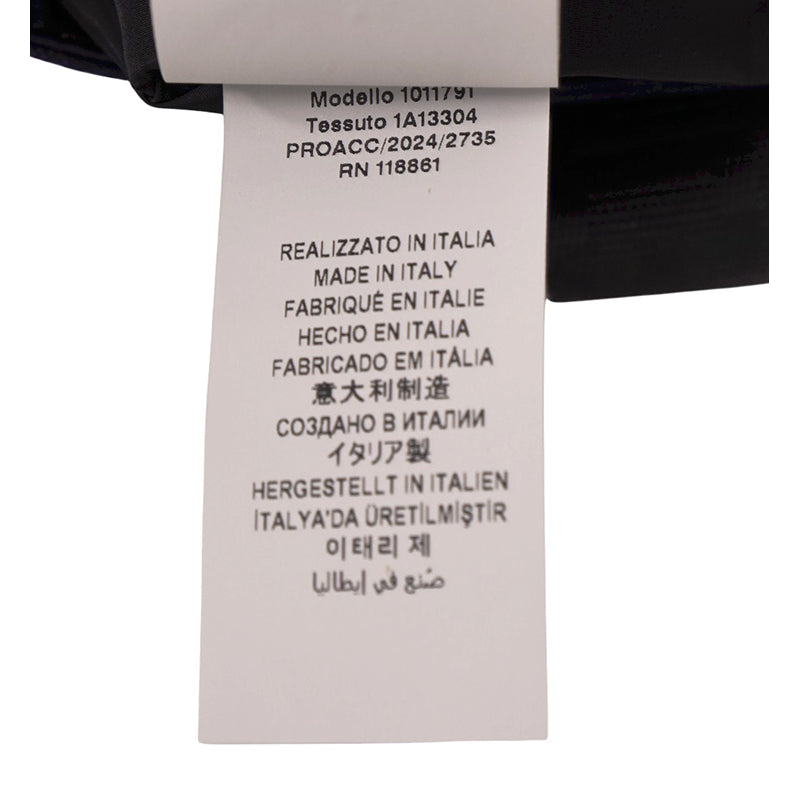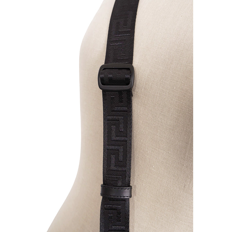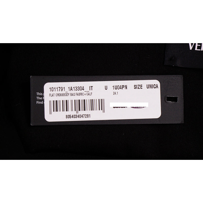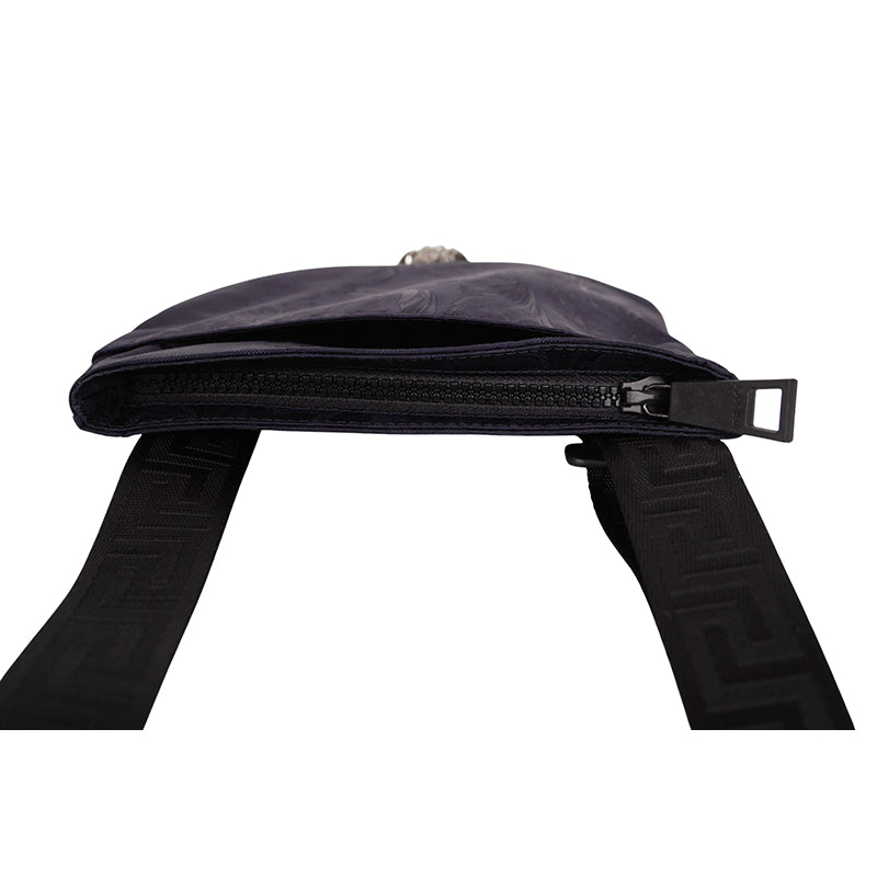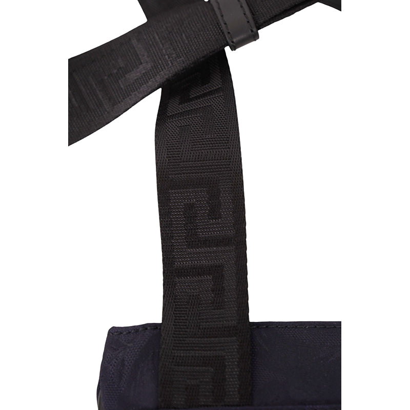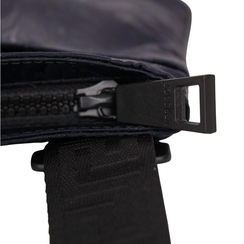 Authentic Versace bag in a versitle everyday style. Classic floral Barocco Baroque jacquard in a nay blue nylon with black leather piping. Polished silver Medusa head logo. Adjustable Greca-patterned web black strap. Plastic chunky zip closure. Front slip pocket. Nylon-lined interior. Style 1011761. Made in Italy. A sleek and functional design that combines everyday utility with signature Versace luxury.