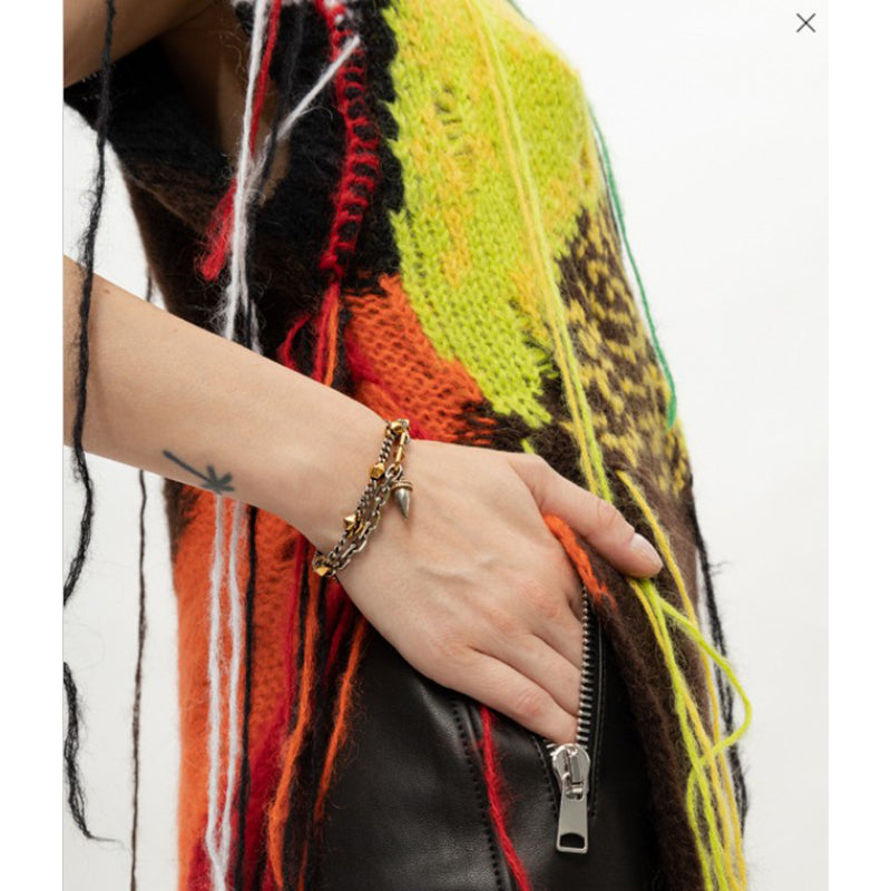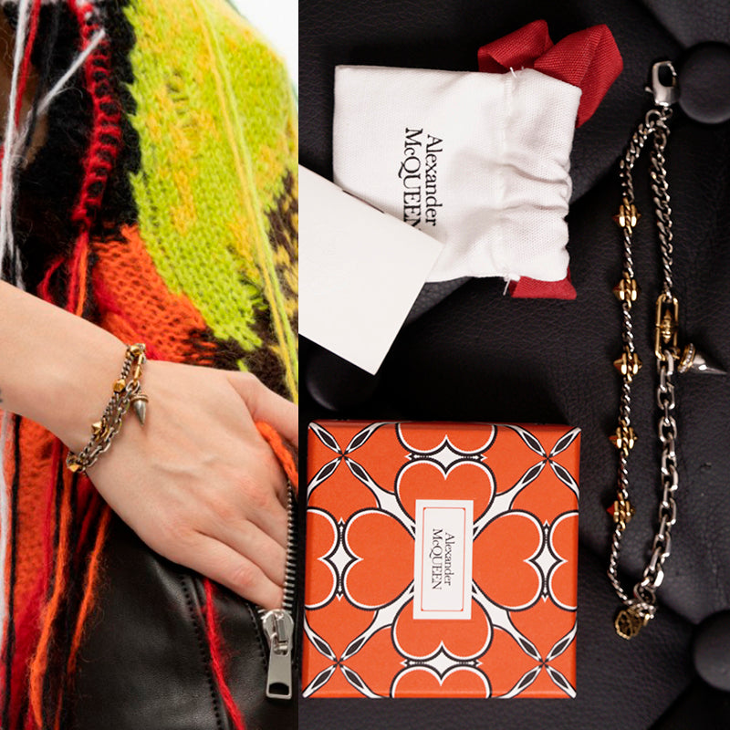 Authentic Alexander McQueen bracelet with a punk-inspired edge. Antiqued silver and gold-tone brass in a layered curb chain design. Embellished with pyramid studs and a crystal-detailed spike charm. Finished with a logo-engraved charm. Lobster clasp. Style 718262. Made in Italy. Great way to add edge to any outfit, from jeans to evening wear.