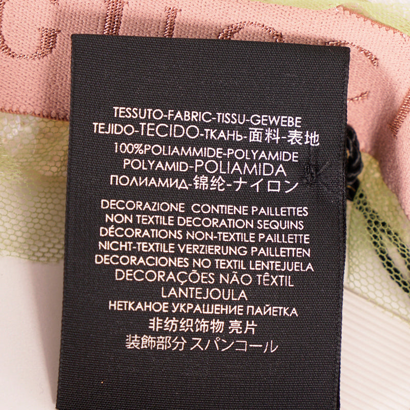 Authentic Gucci headband in a stunning style that can be worn day or night. Braided headband designed with shimmering iridescent sequins with a touch of light green tulle. Nude blush elastic logo-jacquard band that ensures a comfortable fit. 100% Polyamide. Style 600253. Made in Italy. Perfect for a wedding or just with a sun dress.