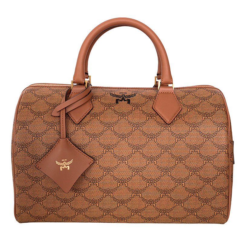 Authentic MCM Boston bag in a classic style for every day wear. Signature Lauretos monogram Visetos. Cognac brown coated canvas with smooth cognac nappa leather trim. Structured duffle silhouette with rounded top handles and a top zip closure. Matte gold-tone hardware. Detachable/adjustable leather strap for shoulder or crossbody wear. Spacious interior with soft lining and slip pocket. Made in South Korea. Style MWBESEA07CO001. Timeless style, perfect for everyday or travel.