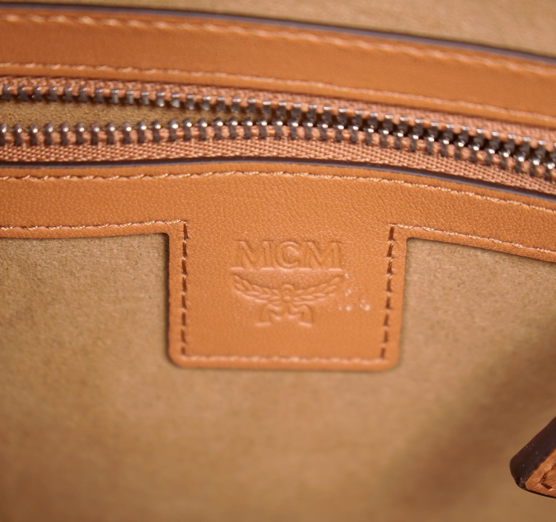 Authentic MCM tote bag in a rich, timeless cognac shade. Smooth Spanish leather with an oversized embossed MCM logo at the front. Structured silhouetteto. Includes both a wrist strap and a crossbody strap. Adjustable/detachable shoulder strap featuring a herringbone weave. Zip fastening. Internal zip-fastening pocket .Style MMRDATA03CO001. Made in South Korea. A versatile bag— equally suited for polished city errands and everyday wear.