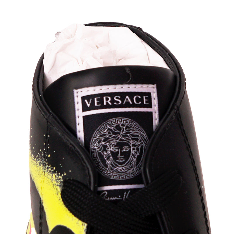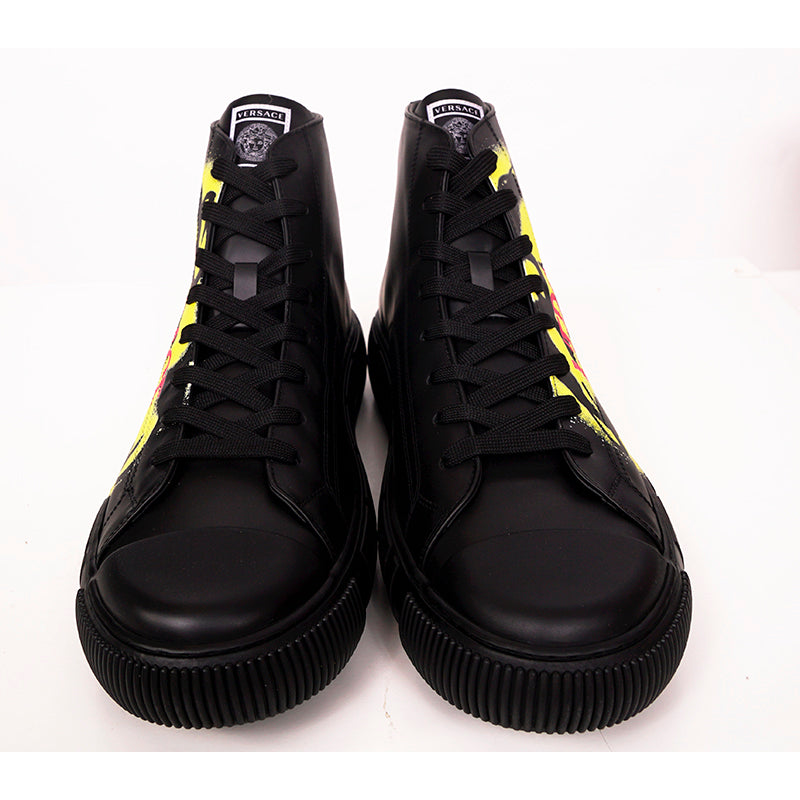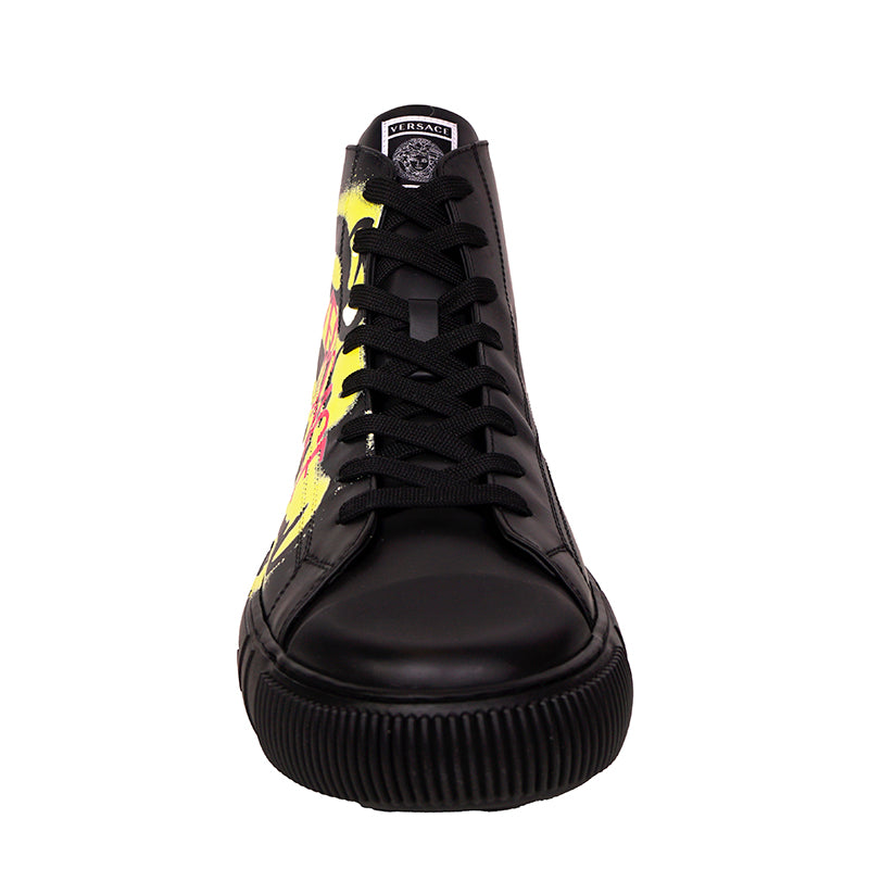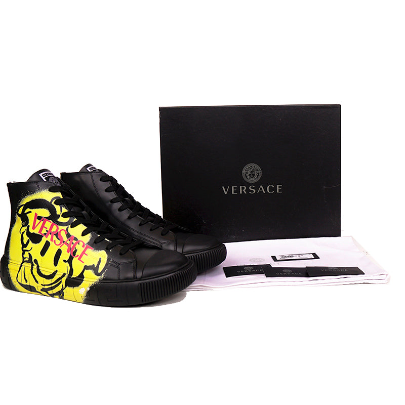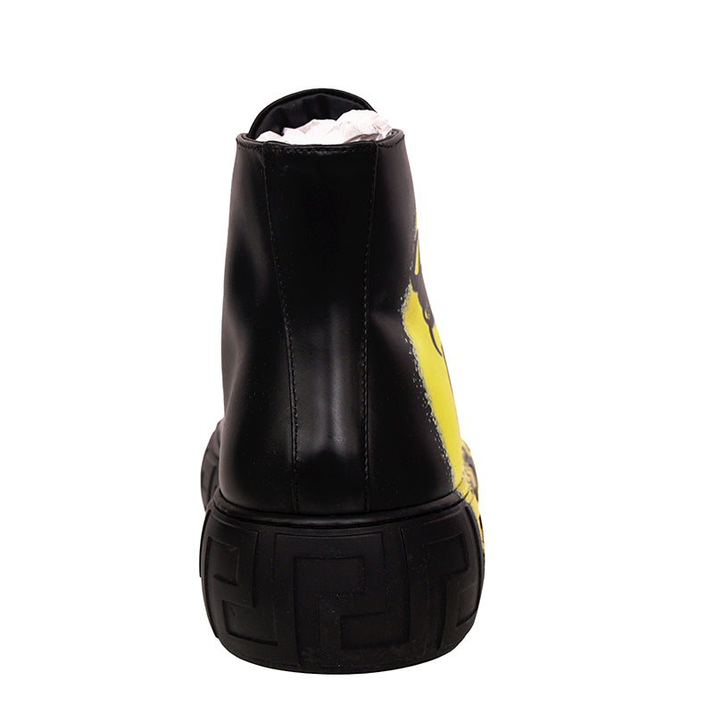 Authentic Versace sneakers from the Smiley collection. Iconic Medusa head in a graffiti-inspired motif in yellow. Black leather uppers. High-top sneakers. Black rubber outsole complete with signature embossed Greca trim. Round toe. Front lace-up fastening. Tonal stitching. Flat rubber sole with Medusa logo. Style DSU8403. Made in Italy. Very rocker chic, sure to get noticed.