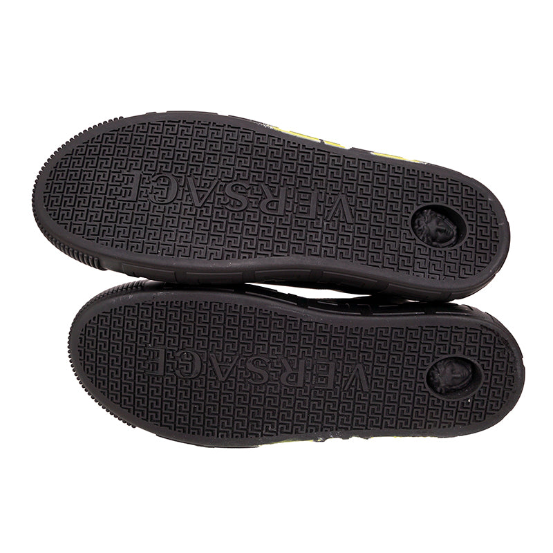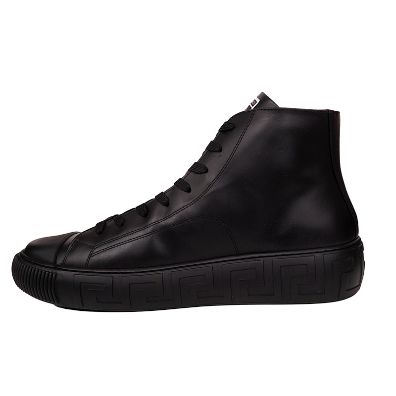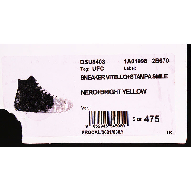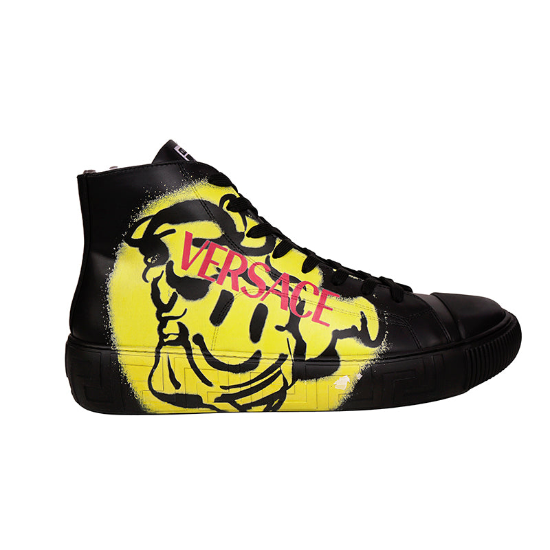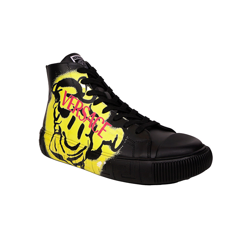 Authentic Versace sneakers from the Smiley collection. Iconic Medusa head in a graffiti-inspired motif in yellow. Black leather uppers. High-top sneakers. Black rubber outsole complete with signature embossed Greca trim. Round toe. Front lace-up fastening. Tonal stitching. Flat rubber sole with Medusa logo. Style DSU8403. Made in Italy. Very rocker chic, sure to get noticed.