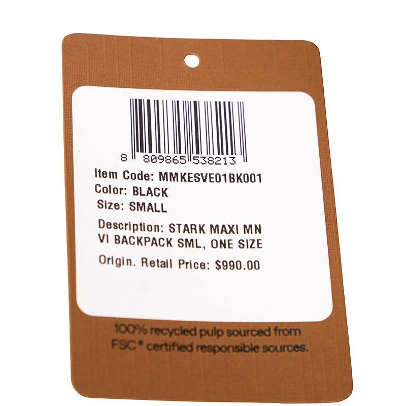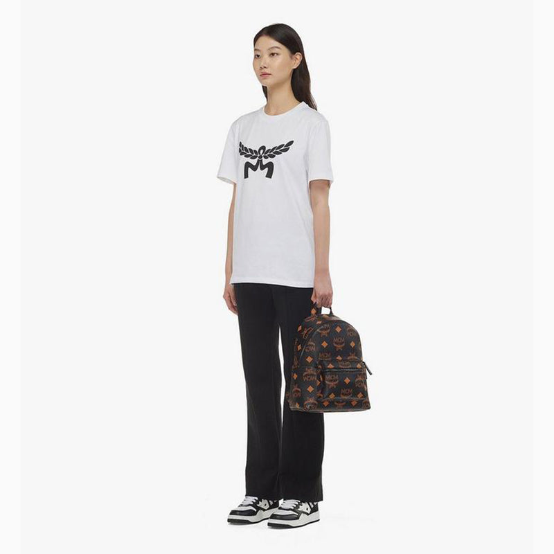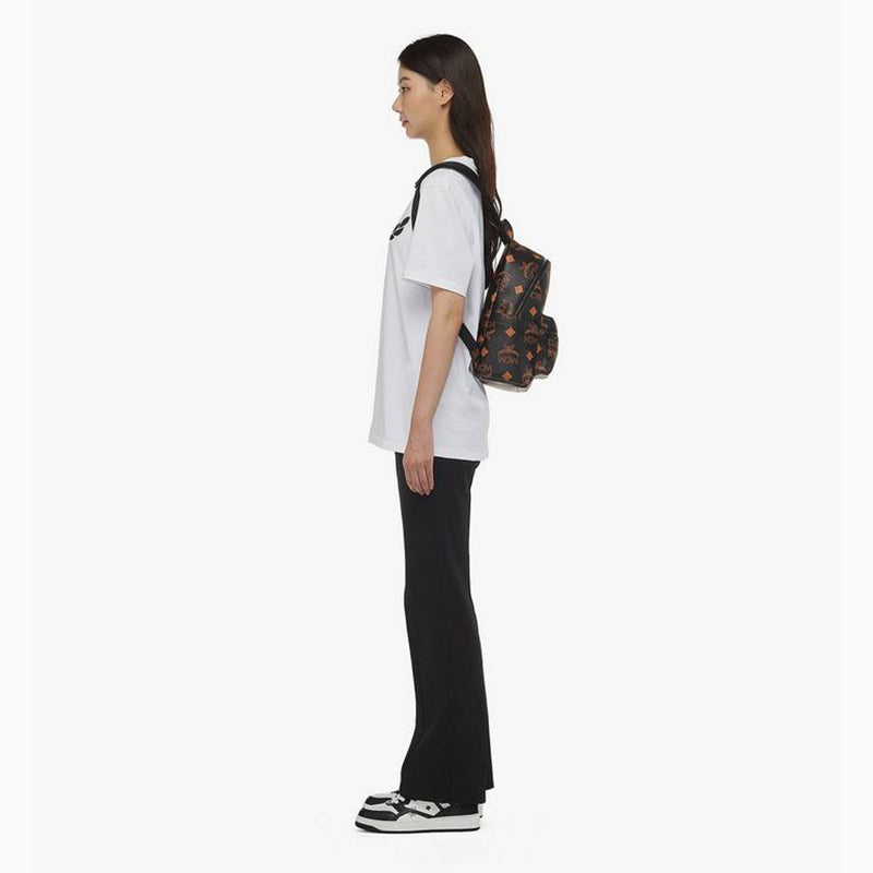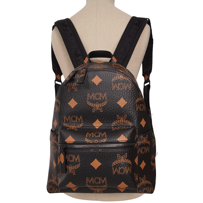 Authentic MCM backpack with the Maxi Monogrammed print. Stark backback. Black Visetos coated‑canvas with orange/tan monogram print and contrasting. Dome silhouette. Front zip pocket. Top double zip closure. Leather‑wrapped carry handle. Adjustable black nylon webbing straps. Black matte hardware throughout. Interior lined in brown/tan. Style: MMK ESVE01 BK001. Made in South Korea. Ultra–stylish, versatile and perfectly sized for essentials.
