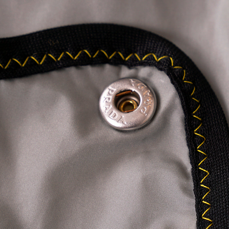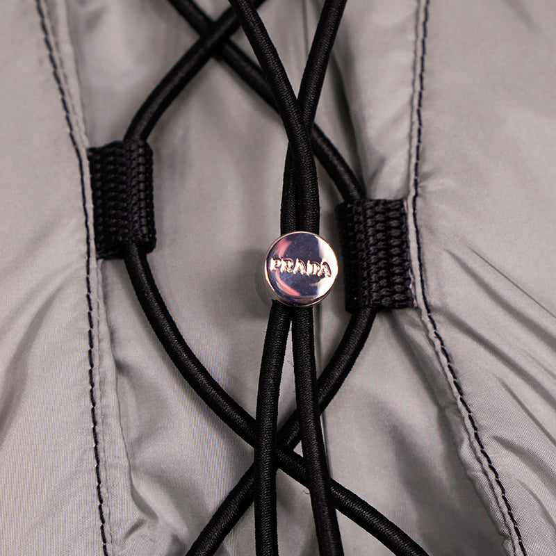 Authentic Prada Re-Nylon Piuma Poncho in a sporty style. Metallic gray (Acciaio) in Prada’s signature regenerated nylon. Removable cropped cape layer that snaps on and off. Drawstring hood. Front lace-up detail. Zip pockets with black trim accents. Iconic enamel triangle logo in front center. Tonal hardware. Style 292002. Made in Italy. A rare, avant-garde design merging utilitarian function with Prada’s modern minimalism.