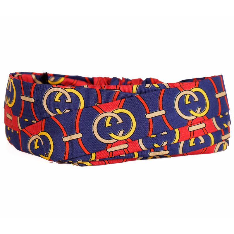 Authentic Gucci headband in a stunning print. Medium blue and red back ground has interlocking GG rhombus print in tan and yellow. Elastic back. Silk twill. 100% silk. Style 572207. Made in Italy. Perfect for upcoming spring and summer.