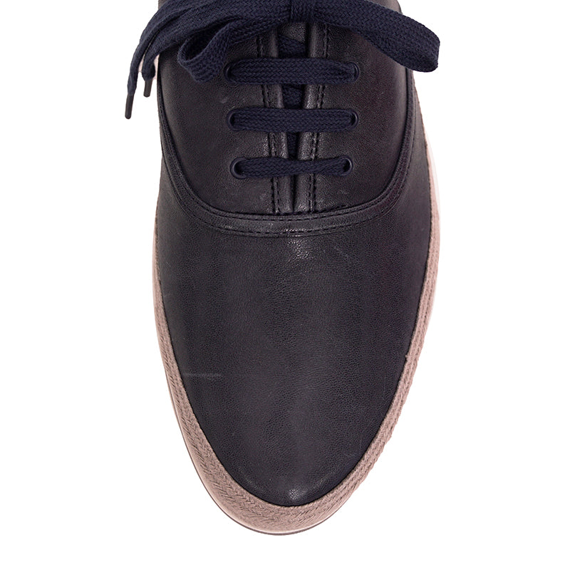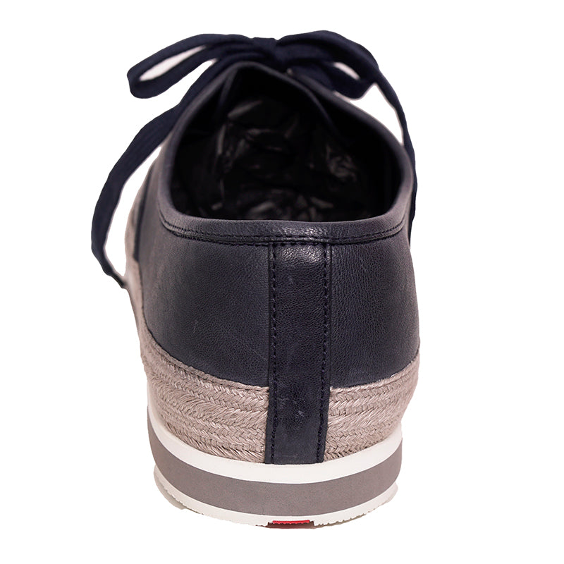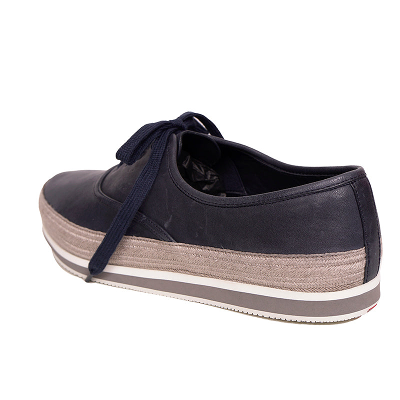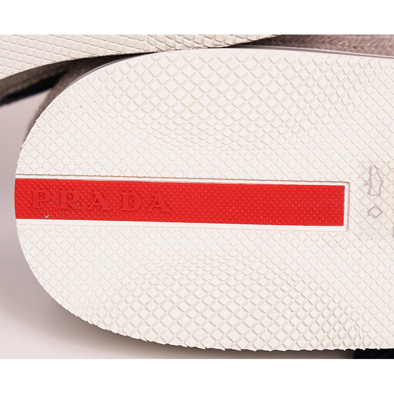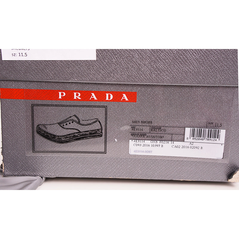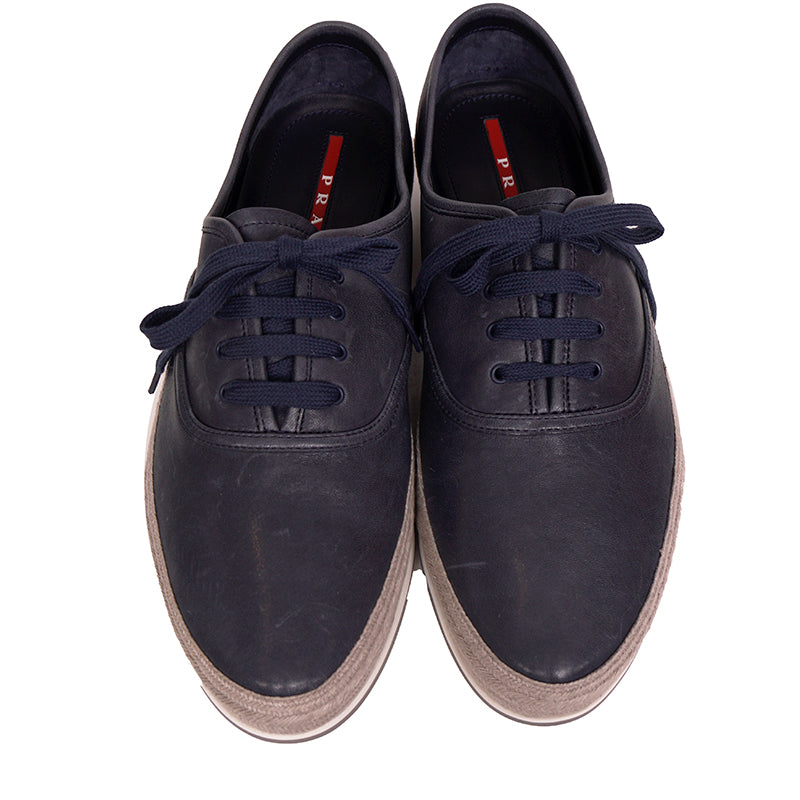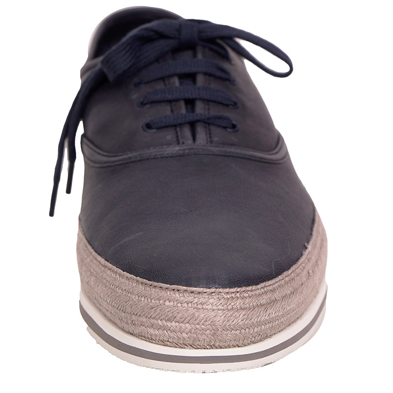 Authentic Prada sneakers in a fresh style for summer. Distressed leather upper called Nappa Aviator. Blue color called Baltico. Espadrille mid sole blending to a rubber traditional sneaker soles. White soles with Line-A red logo. Lace-up front. Almond toe. Style 4E3114. Made in Vietnam. Perfect for summer, pair with shorts to jeans.