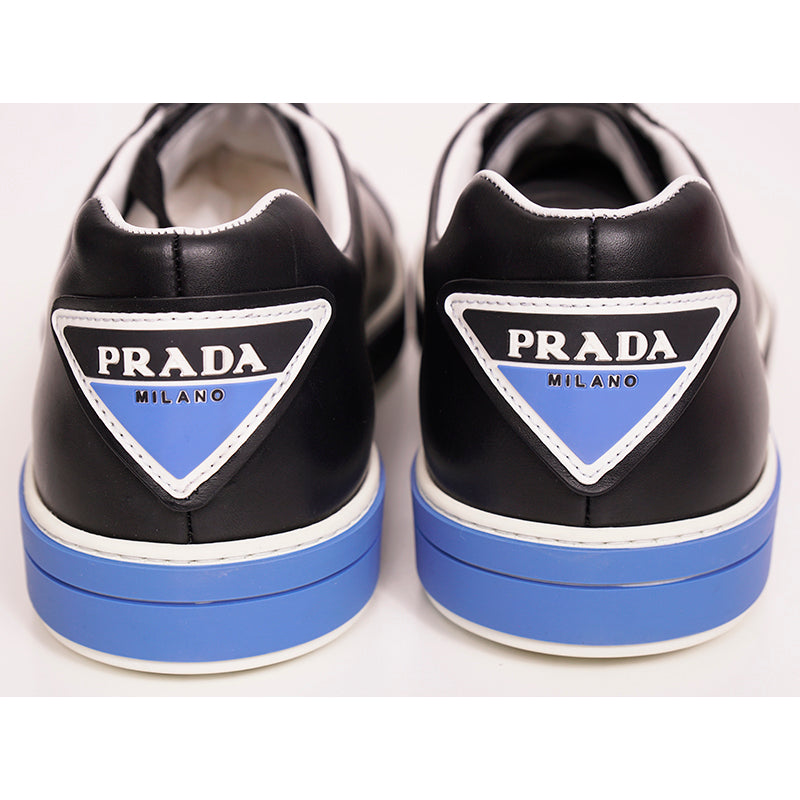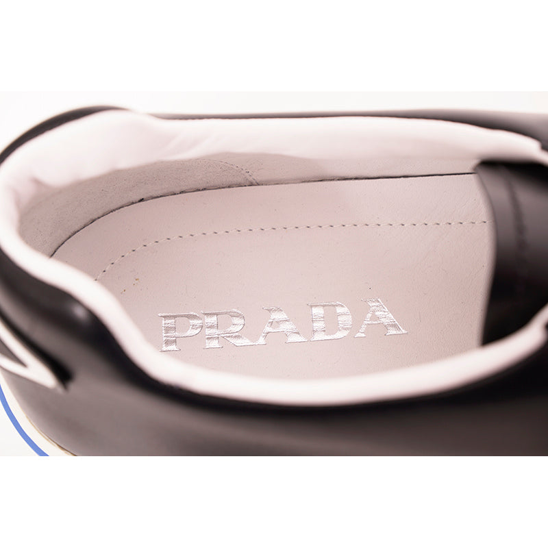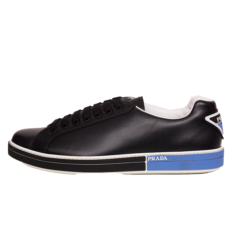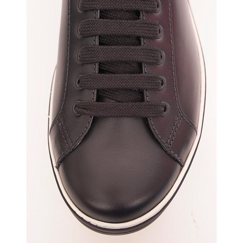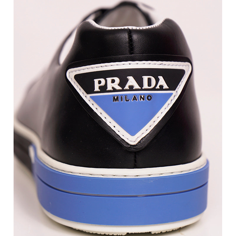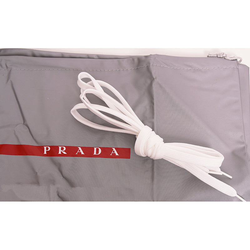 Authentic Prada sneakers in a sleek and sporty style. Black leather upper. Black laces with Prada logo at the ends (includes a pair of white laces). Large triangle logo at heel. White rubber sole with logo Aline stripe. Style 4E3314. Made in Italy. Perfect weekend sneakers, sure to get noticed.