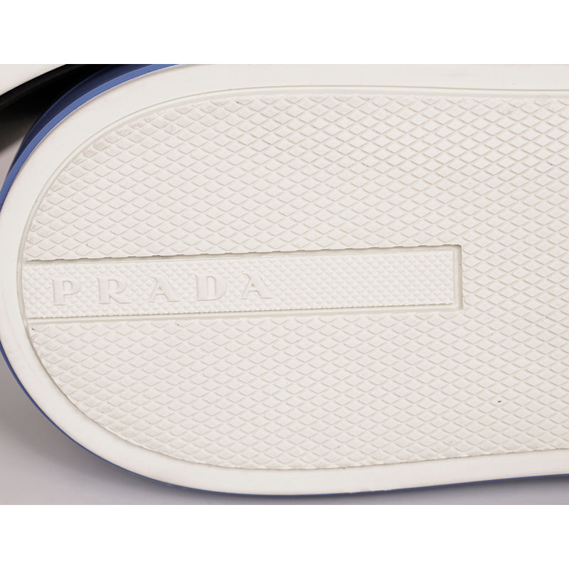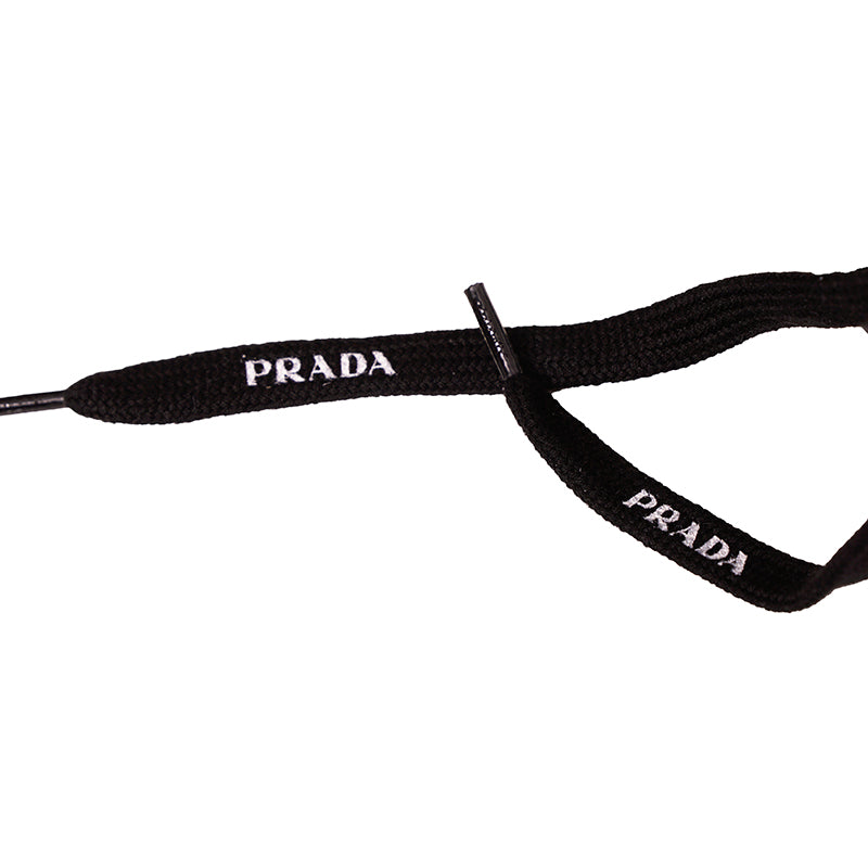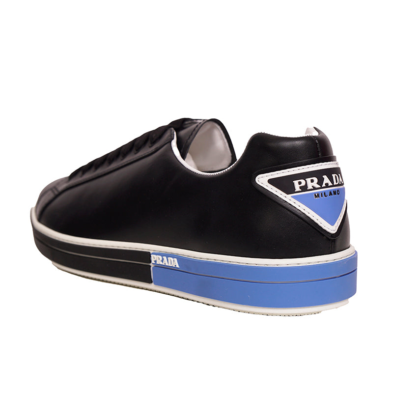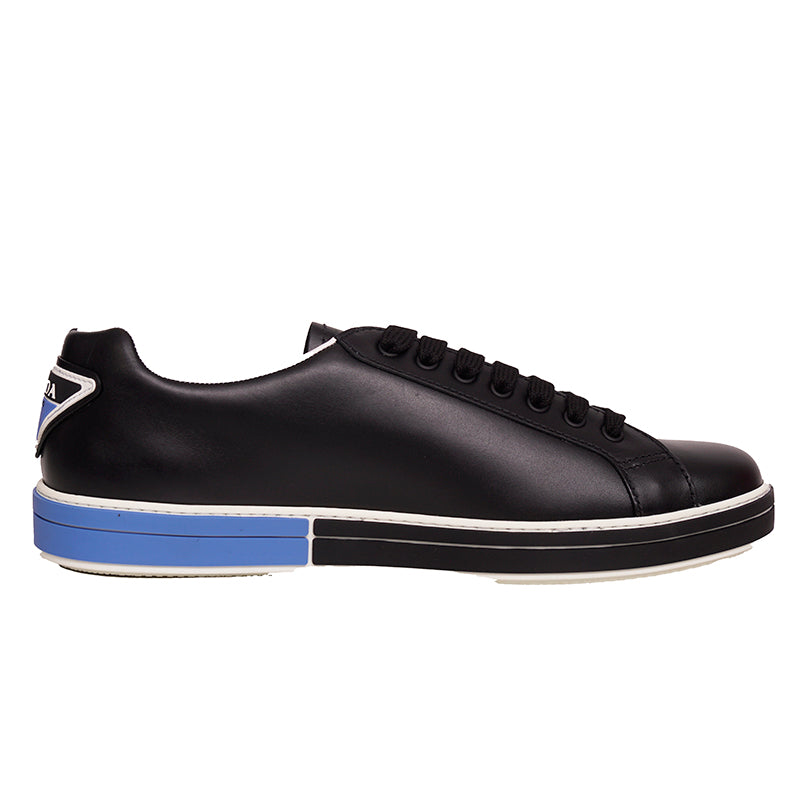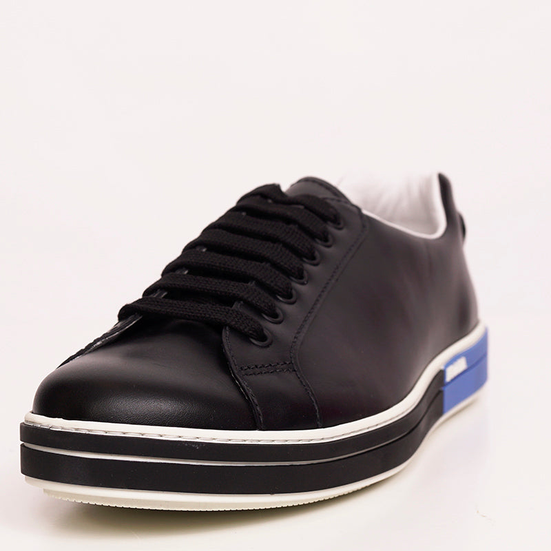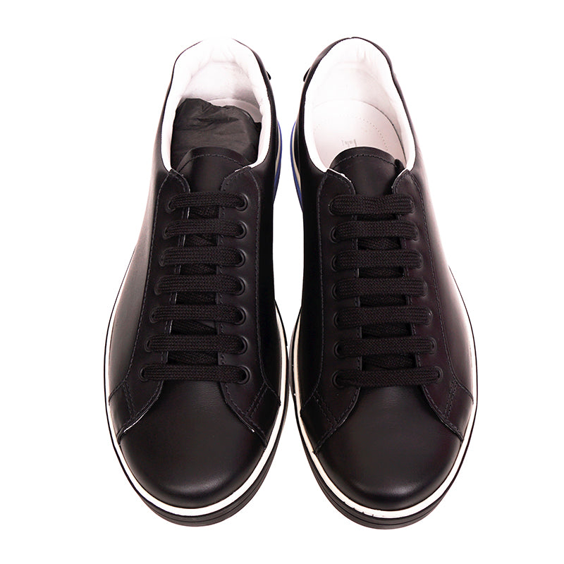 Authentic Prada sneakers in a sleek and sporty style. Black leather upper. Black laces with Prada logo at the ends (includes a pair of white laces). Large triangle logo at heel. White rubber sole with logo Aline stripe. Style 4E3314. Made in Italy. Perfect weekend sneakers, sure to get noticed.