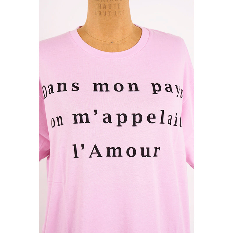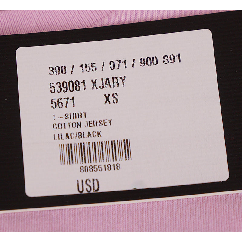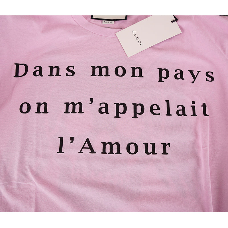 Authentic Gucci t-shirt in a cool style. Lilac cotton jersey tee in an oversize fit. Front has reading "Dans mon pays on m'appelait l'Amour." (In my country I was called Love.) In back is a large winged black skull. 100% Cotton. Style 539081. Made in Italy. Perfect with skinny jeans.