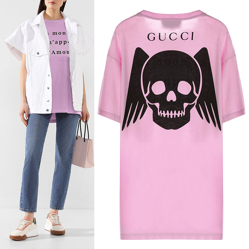 XS NEW $690 GUCCI Lilac Pink BLACK WINGED SKULL LOGO Oversize TEE T-SHIRT TOP